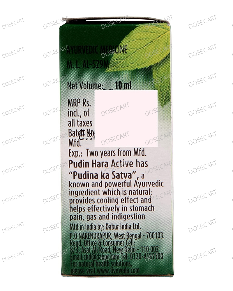 Dabur Pudin Hara Active Liquid contains Pudina Satva as the main ingredient and is known to give quick relief from stomach ailments like stomach ache, gas and indigestion. A trusted and fast-action remedy, Pudin Hara is 100% natural and safe.